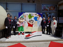 「クレヨンしんちゃん」と「大曲の花火」をテーマにした観光フォトスポットを披露する老松博之大仙市長ら関係者