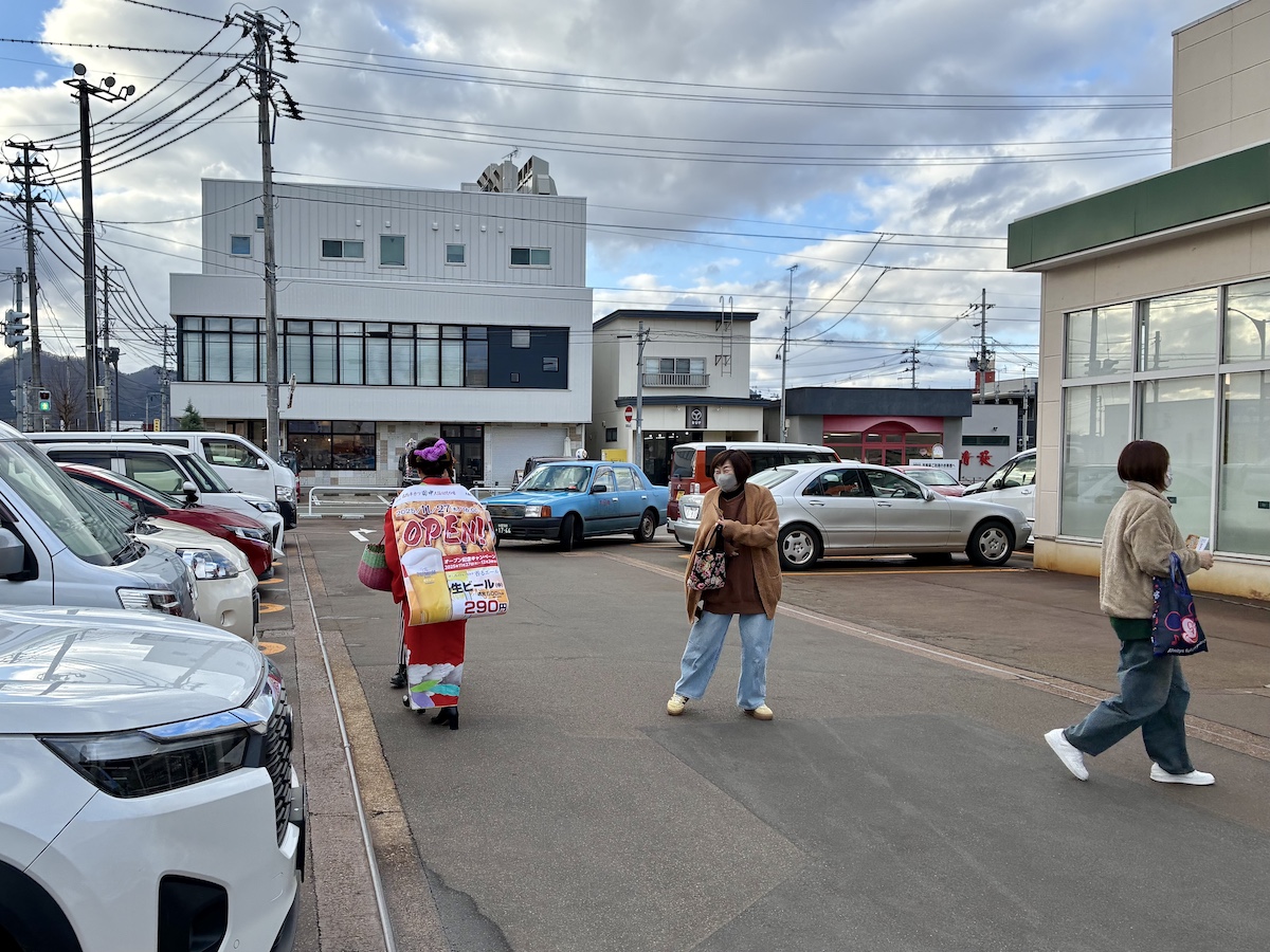 秋田県内唯一となるプロのちんどん屋「「ダースコちんどん隊」が11月29日、大曲駅前の商店街を練り歩き、「串カツ田中大曲駅前店」(大仙市大曲通町)のオープンをアピールした。