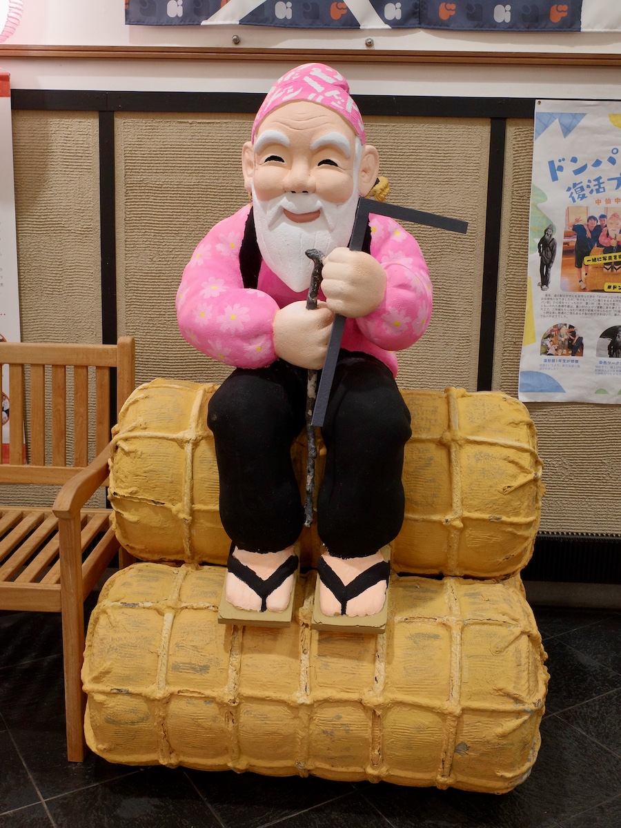 道の駅なかせん(大仙市長野高畑)のシンボルとして親しまれてきた「ドンパンじっちゃ」が修復され、11月27日、同施設内に再設置された。