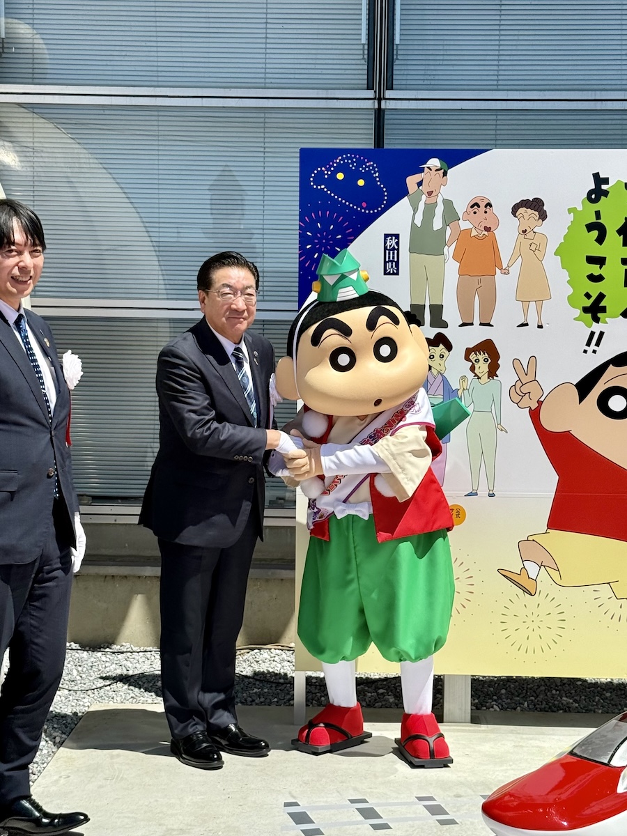 大曲駅西口で4月25日、人気アニメ「クレヨンしんちゃん」と「大曲の花火」をテーマにした観光フォトスポットの完成セレモニーが開かれた。